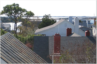 Present-day views from the rooftop of the Charles Ives Hatsell House. The Andrew Lee Hatsell House circa 1827 is the first house to the south. Beyond are several other houses on Orange Street just steps away from Taylor's Creek and Carrot Island beyond. Beyond the Beaufort Inlet is Fort Macon. Without the newer houses between the 1827 house and the waterfront, Charity Hatchell Read and Emeline Pigott would have been able to have a clear view of the siege of the fort on April 26, 1862. More views...descriptions below images.